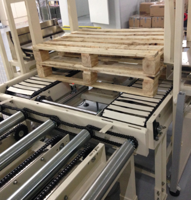 自动拆分木栈板输出,自动拆分纸板放木栈板上,输送到主线体,包装好的产品通过XYZ三轴自动机械臂码放到栈板上,码放数量完成,自动输送到后段线